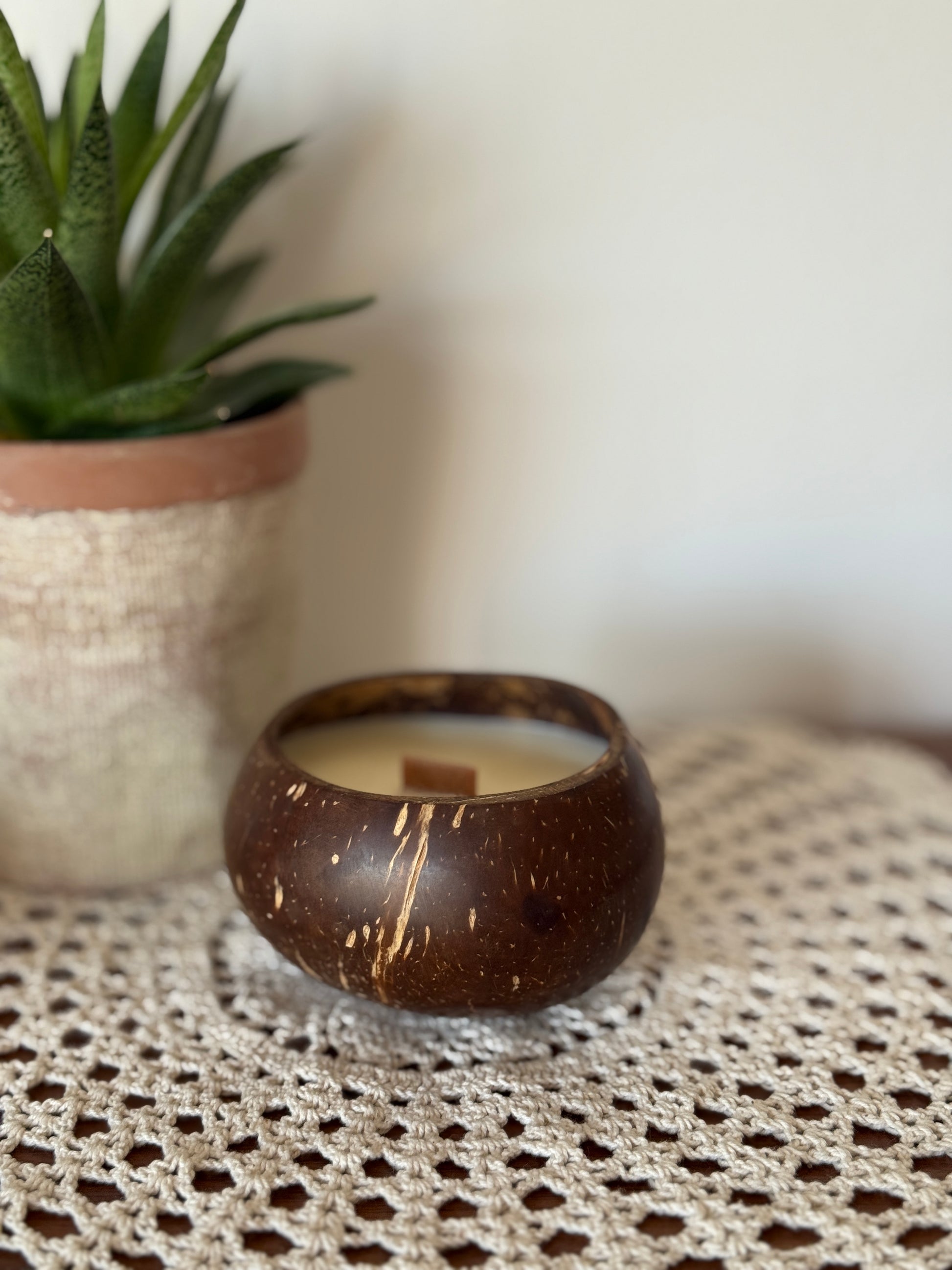 Vela hecha a mano, en cuenco de coco natural, con mecha de madera que chispea suave como una mini chimenea. Ideal para crear un ambiente de calma, calidez y conexión.